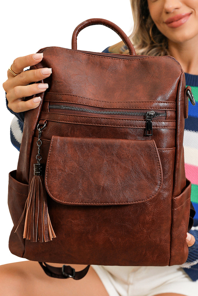Dark Brown Tassel Decor Retro PU Large Capacity Backpack